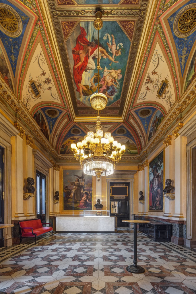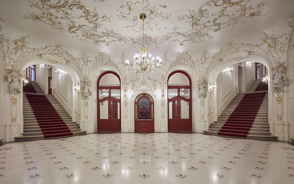 Vstupní vestibul je vyložen mramorem a zdoben štukovou výzdobou. Dominantou je monumentální schodiště vedoucí do hlediště, po jehož stěnách se nacházejí alegorické malby a reliéfy oslavující umění, vlast a národní ctnosti.