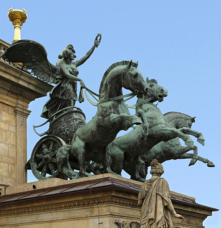 Střechu korunuje výrazná měděná kupole s alegorickými sochami Trig – trojspřeží okřídlených koní, kteří táhnou vůz Vítězství. Tyto bronzové sochy jsou dílem Bohuslava Schnircha a byly instalovány po rekonstrukci v 80. letech 19. století.