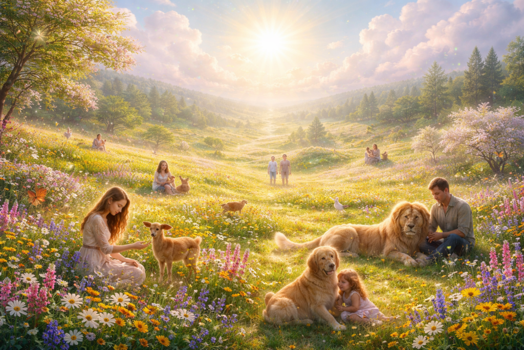 Nevím, jestli se tomu místu dá říkat nebe, protože slova jsou na něj příliš malá. Když si ho představuji, vidím nekonečnou louku, která nikdy neuvadá. Květiny tu kvetou v barvách, jaké na Zemi neexistují – jemnější než ranní světlo, hlubší než večerní obloha. Každý krok po té trávě je měkký, jako by tě sama země vítala.