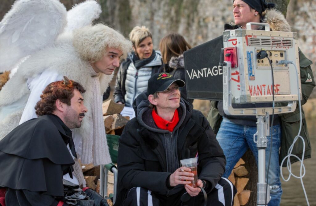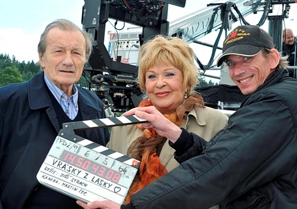 Při natáčení Anděl Páně s herci Jiřím Dvořákem a Ivanem Trojanem