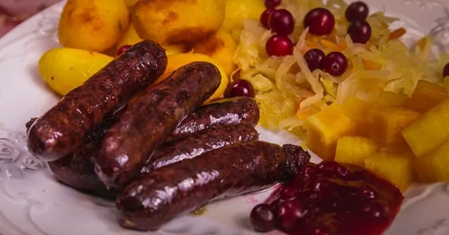 Tradiční vánoční večeře je vydatná a vychází z místní kuchyně. Na stole nechybí vepřová pečeně, vařené brambory, kysané zelí a krvavé klobásy (verivorst).